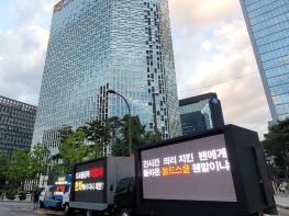 지난달 30일 한화그룹 사옥 앞에서 진행된 트럭 전광판 시위의 모습 (사진=고초록 기자)…