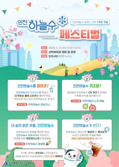 인천광역시는 인천의 수돗물인‘인천하늘수’브랜드 선포 1주년을 기념해 오는 22일 선학체육관 정문 앞 광장에서 열리는 2023 세계 물의 날 기념행사에서 수돗물 홍보캠페인‘인천하늘수 페스티벌’을 펼친다고 밝혔다.