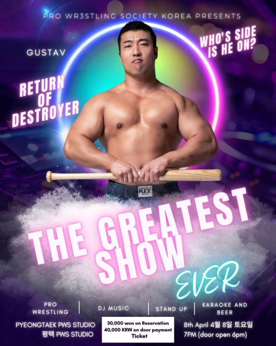 ![]() ![]() PWS 'GREATEST SHOW EVER' (출처 : PWS) 2023년 4월 8일 토요일 19시경기도 평택 PWS 스튜디오 PWS 'GREATEST SHOW EVER'스페셜 이벤트 1 유명 격투게임 코스플레이어 '멜로디 리'를 킹오프파이터즈 '98로 격파하라! 스페셜 이벤트 2 은비연 '진개성 응원 선언' 입장 발표 스페셜 이벤트 3 DJ 쉐인 크레이머의 디제잉 스페셜 이벤트 4 스탠드업 코미디언 디스 배틀 아서 민수 vs 크리스틴 핌레이 스페셜 이벤트 5 구스타프 복귀식