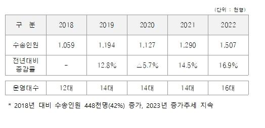 이번 전세버스 투입(2대)으로 평일 운행횟수가 1일 104회에서 110회로 6회씩 늘어나면서 출근시간대 수송여력을 확보할 수 있게 됐으며, 휴일 운행횟수도 1일 60회에서 78회로 늘어나 주말 이용객의 교통편의도 높아지게 됐다. 시는 이에 대해 이번 운영체계 개편에 따른 안전요원을 배치해 최근 밀집 사고와 차내 전도사고 예방 등 이용객 안전 확보와 이용 혼선을 최소화하도록 신속하게 현장대응할 계획이다.