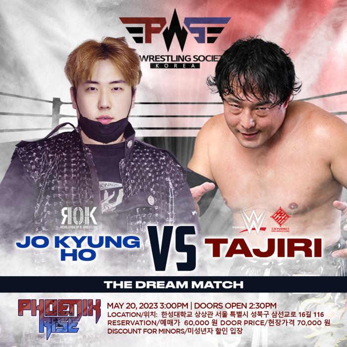 'PWS - 피닉스 라이즈'의 세미 메인이벤트는 세계 최대 프로레슬링 단체 WWE의 크루저급 챔피언을 지낸 타지리와 한국 프로레슬링 최고의 선수인 조경호가 싱글 매치로 맞붙는다.