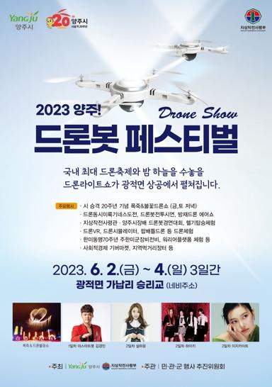 양주시는 오는 6월 2일부터 4일까지 3일간 육군 지상작전사령부와 함께 ‘2023 양주! 드론봇 페스티벌’을 개최한다고 밝혔다.