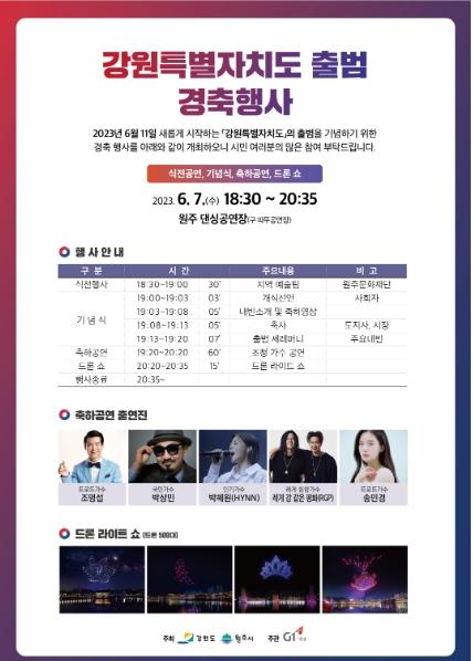 강원도가 6월 11일 강원특별자치도로 새롭게 탄생한다. 이를 시민과 함께 경축하고자 6월 7일 저녁 6시 반, 원주 댄싱공연장(구, 따뚜공연장)에서 '강원특별자치도 출범 경축행사'가 열린다.