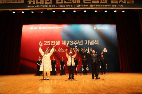 특히, 행사 말미에는 김준태 6.25참전유공자회 안동시지회장과 권기창 안동시장, 김경도 안동시의회 부의장이 무대에 올라 만세삼창을 외치자 350여 참석자들이 열의에 찬 후창으로 함께했다. 이어, 안동시립합창단이 6.25 노래를 제창하며 대단원의 막을 내렸다.