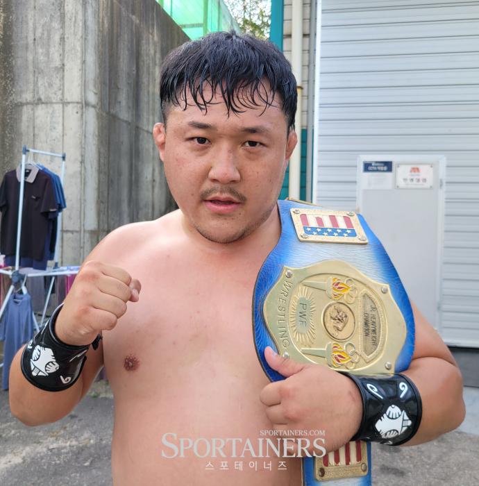 9/2 신한국 프로레슬링 대회에서 하다온(ROK)을 상대로 타이틀 방어에 성공한 타바바 [사진=고초록 기자]