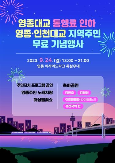 인천광역시는 오는 9월 24일 일요일 오후 6시부터 영종 씨사이드파크에서 '영종대교 통행료 인하 및 영종·인천대교 지역 주민 무료 기념행사'를 개최한다고 밝혔다.