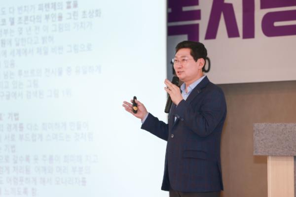 이 시장은 레오나르도 다빈치의 작품 ‘살바토르 문디’를 소개하며 특강을 시작했다. ‘남자 모나리자’로 평가받는 이 작품에 대해 이 시장은 경매에서 사우디아라바이아의 ‘무함마드 빈살만’ 왕세자에게 약 4억 5000만달러(현재 환율로 한화 약 6000억원)에 낙찰되면서 세계에서 가장 높은 가격으로 거래된 그림으로 기록됐다고 설명했다.