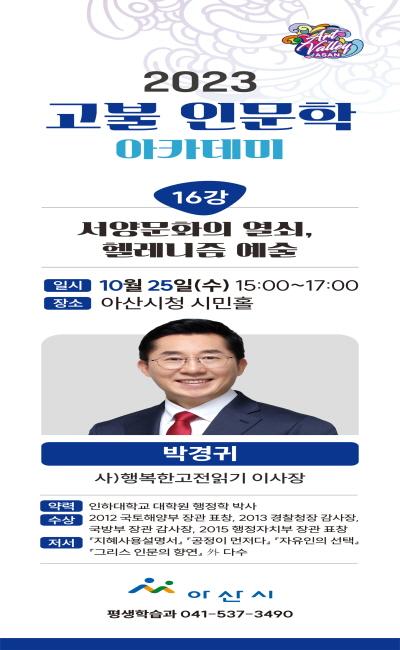 박경귀 아산시장이 오는 25일 시청 시민홀에서 열리는 고불 인문학 아카데미 열여섯 번째 강연자로 나선다.