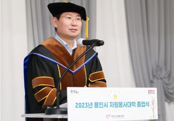 이상일 용인특례시장이 지난 24일 시청 컨벤션홀에서 열린 2023년 용인시 자원봉사대학 졸업식에서 ‘시민 자원봉사 리더 양성’ 과정 수료생 40명에게 졸업장과 격려 인사를 전했다.