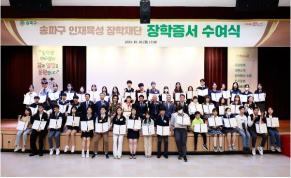 지난 30일 송파구청에서는 이를 기념하기 위한 ‘2023년 하반기 장학증서 수여식’이 열렸다. 장학생과 학부모 등 총 90여 명이 한자리에 모여 장학증서를 전달받았으며, 서강석 송파구청장과 재단 이사 등 주요 관계자들도 참석해 뜻깊은 날을 기념했다.