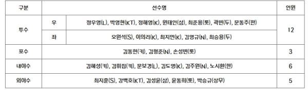 대신 예비 엔트리 20명에 포함된 투수 조병현(SSG), 이병헌(두산), 김태경(상무), 포수 허인서(상무), 내야수 한태양(상무), 나승엽(롯데), 문현빈(한화) 등 총 7명이 대구 캠프에 합류했다.