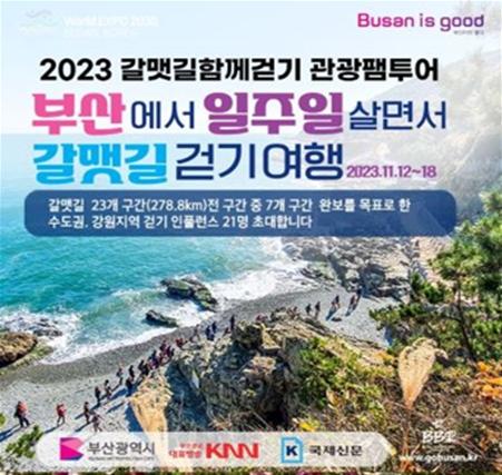부산시는 오는 11월 12일부터 11월 18일까지 일주일간 '부산 일주일 살면서 갈맷길 여행하기'라는 콘셉트로 팸투어를 운영한다고 밝혔다.