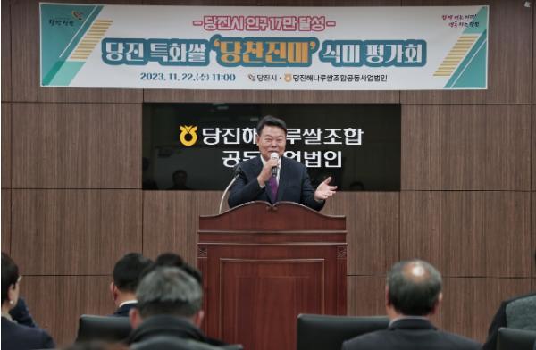 당진시농업기술센터는 지난 22일 당진해나루쌀조합공동사업장(송악읍 석포리)에서 오성환 당진시장을 비롯한 지역 내 농협조합장 등 관계자 40여 명이 참석한 가운데 ‘당찬진미’식미*평가회를 개최했다.