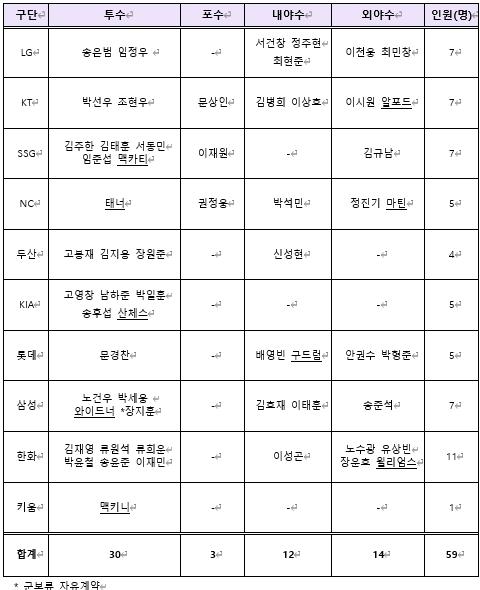구단 별로는 KT, NC가 58명으로 가장 많았고, 그 뒤를 이어 삼성, 키움 56명, SSG, 롯데 55명, 두산, KIA, 한화 54명, LG 42명이다.