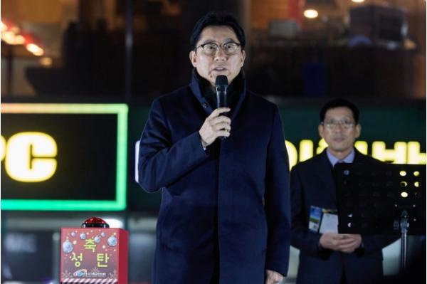 박경귀 아산시장이 지난 10일 온양온천역 광장에서 열린 성탄 트리 점등식에 참석해 “예수 그리스도를 제대로 기억하고 또 십자가의 의미를 새기는 그런 시간이 됐으면 좋겠다”고 밝혔다.