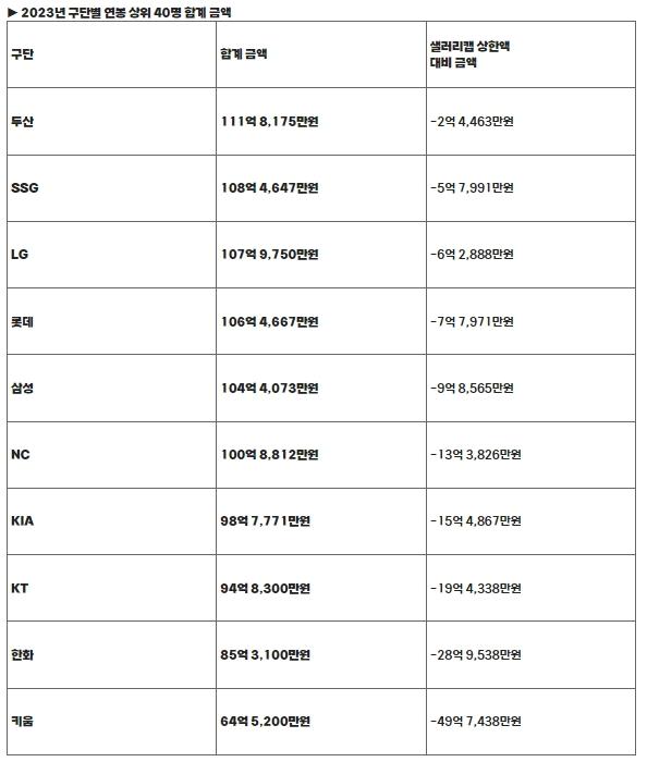 2023년 구단별 연봉 산출 결과 샐러리캡 상한액을 초과한 구단은 없었다.