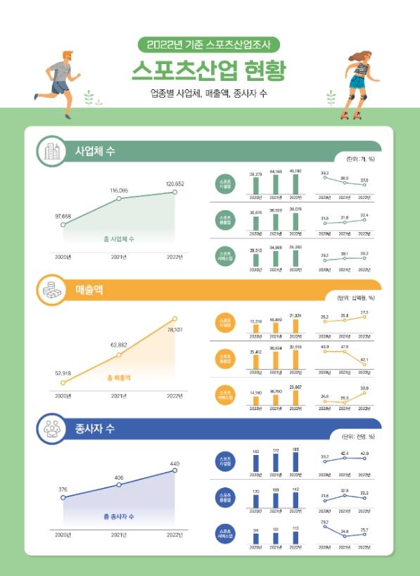 문화체육관광부는 1월 4일, 2022년 12월 기준으로 국내에서 스포츠산업을 영위하는 사업체를 대상으로 진행한 ‘스포츠산업조사’의 주요 결과를 발표했다.