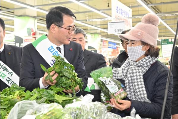 10일 하나로마트 양재점에서 열린 특판 행사 첫날에는 장충남 군수를 비롯해 지역농협장들이 함께 참석해 보물초를 홍보했다.