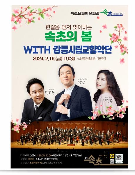 속초시는 속초문화예술회관 2024년 첫 번째 기획공연으로 “한걸음 먼저 맞이하는 『속초의 봄 WITH 강릉시립교향악단』”을 2월 16일 금요일 저녁 7:30에 개최한다.