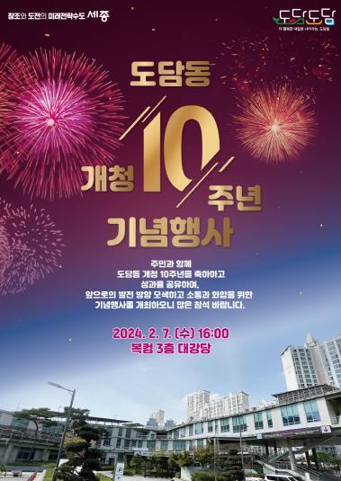 세종특별자치시 도담동이 오는 7일 도담동 개청 10주년을 맞아 도담동 복합커뮤니티센터 3층 대강당에서 기념행사를 개최한다.