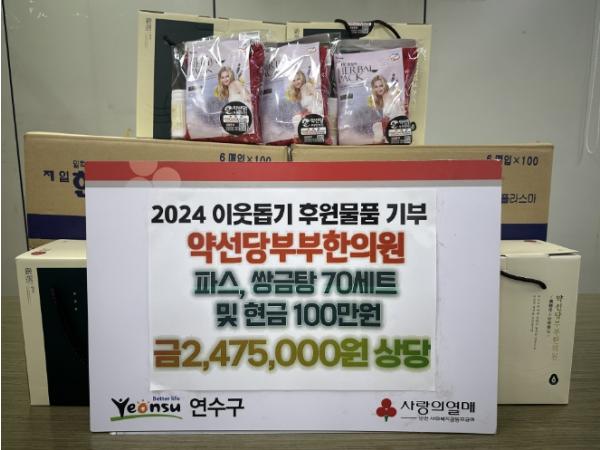 같은 날, 약선당부부한의원(원장 송조)은 도움이 필요한 이웃을 위해 현금 100만 원과 150여만 원 상당의 파스, 소화제, 찜질팩, 쌍금탕 등을 연수구에 전달했다.