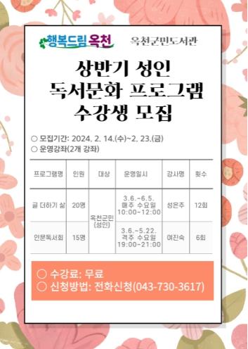 수강 신청은 14일부터 옥천군민도서관 홈페이지를 통해 선착순으로 이루어지고 있으며, 성인 독서문화프로그램은 전화로 신청할 수 있다.