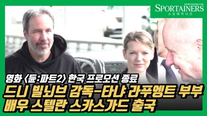 [인천국제공항=스포테이너즈] 영화 '듄: 파트 2' 한국 홍보 차 내한한 드니 빌뇌브 감독과 아내 타냐 라푸엥트, 배우 스텔란 스카스가드가 프로모션 일정을 마치고 23일 오전 인천국제공항 2터미널을 통해 출국했다.