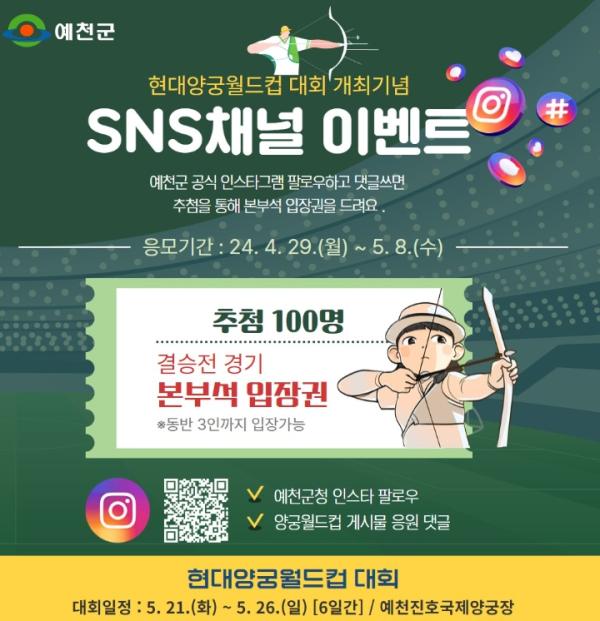 김기정 홍보소통과장은 “이번 이벤트를 통해 현대양궁월드컵도 알리고 예천군 공식 인스타그램도 알리는 기회가 될 것으로 기대한다.”며 “예천군은 군 공식 SNS 채널인 유튜브, 인스타그램, 페이스북, 블로그 등을 통해 군정 소식과 축제, 문화, 명소 등 다양한 주제의 콘텐츠를 제공하고 있으니 많은 관심 부탁드린다.”고 말했다.