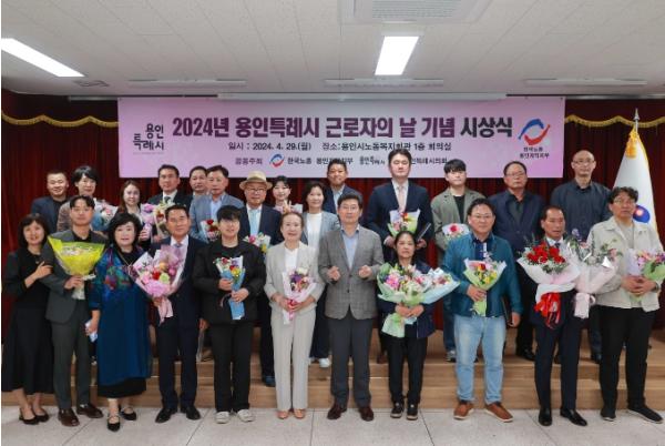 시는 지난 29일 한국노동조합연맹 용인지역지부와 처인구 김량장동 노동복지회관에서 근로자의 날 기념 시상식을 열어 유공자를 표창했다.