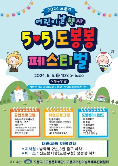 도봉구는 어린이날을 맞아 5월 5일 오전 10시부터 오후 4시까지 도봉구청 앞에서 '5♥5 도봉봉 페스티벌'을 개최한다고 밝혔다.