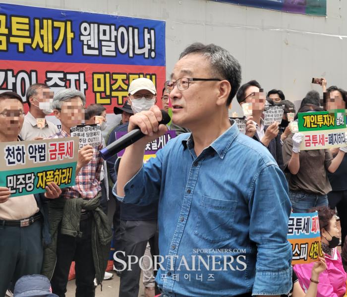 30일 서울 여의도 더불어민주당사 앞에서 '금투세 폐지'를 촉구하는 정의정 한투연 대표(사진=고초록 기자)
