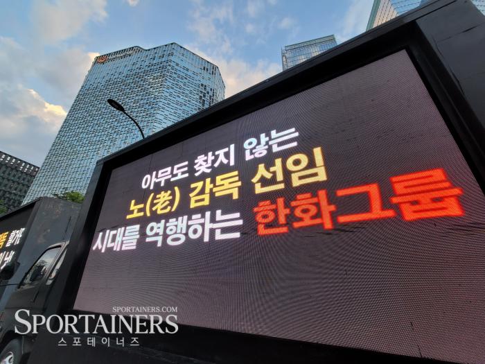 일부 한화 팬들의 메시지 '아무도 찾지 않는 노(老) 감독 선임. 시대를 역행하는 한화그룹' (사진=고초록 기자)