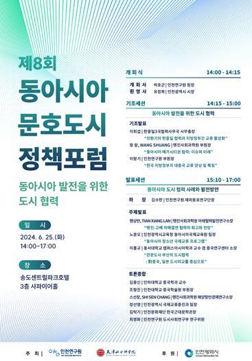 인천연구원과 중국 톈진사회과학원은 오는 6월 25일 오후 2시 송도센트럴파크호텔에서“동아시아 발전을 위한 도시 협력”을 주제로 '제8회 동아시아 문호도시 정책포럼'을 개최한다.
