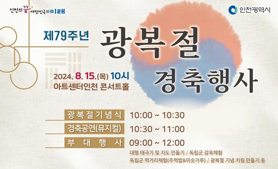 인천광역시가 오늘 8월 15일 아트센터인천 콘서트홀에서 제79주년 광복절을 경축하기 위한 행사를 개최한다고 5일 밝혔다.