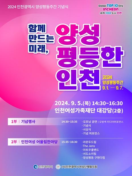 인천광역시는 2024년 양성평등주간(9월 1일 부터 9월 7일)을 맞아 오는 9월 5일 인천여성가족재단 대강당에서 기념행사를 개최한다.