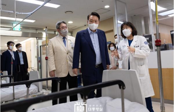 윤석열 대통령은 9월 4일 저녁 8시 50분 쯤 의정부 성모병원 권역응급의료센터를 방문해 1시간 20분 가량 머물며 국민 건강을 위해 헌신하고 있는 의료진을 격려하고 현장의 의견을 청취했다.