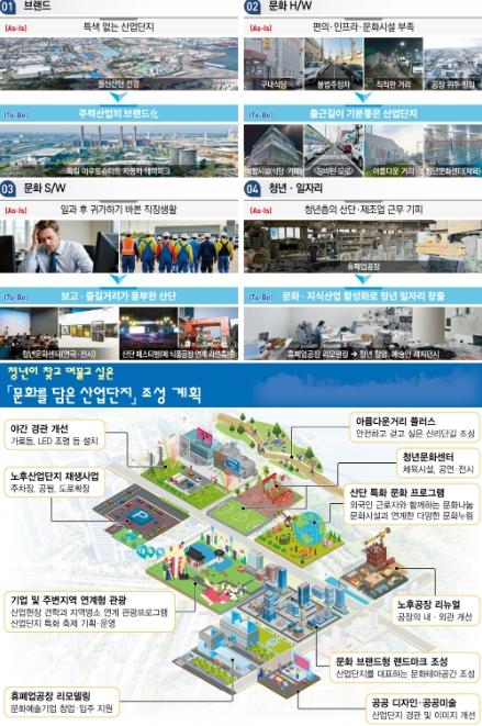 정부는 이번 계획에 따라 첫째, 산업단지의 자긍심을 높일 수 있는 각 산단의 특성에 맞는 통합 브랜드를 구축한다. ▲산업단지별로 주력업종, 역사성 등 특성을 반영하여 브랜드를 개발하고, 도서관?기록관?박물관 기능의 산업 라키비움(Larchiveum), 기업 체험관 등의 상징물(랜드마크)을 건립한다. ▲상징물(랜드마크)을 중심으로 광장, 공원 등 특화 브랜드 공간을 개발하고, 제품 전시·체험관 등을 운영하여 지역의 인기명소(핫플레이스)로 육성한다.