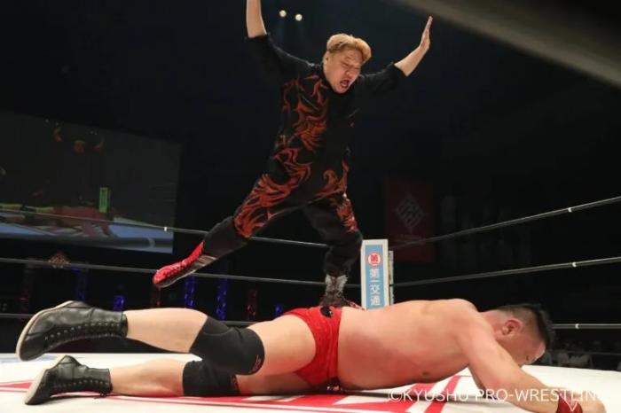 | 규슈 프로레슬링 15주년 대회에서 치쿠젠 료타 이사장을 덮치는 김남훈 (출처: 규슈 프로레슬링) |