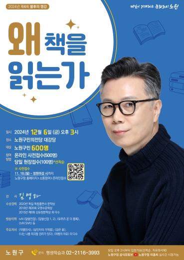 오는 12월 6일 오후 3시 노원구민의전당 대강당에서 개최되는 이번 강의는 ‘왜 책을 읽는가’를 주제로 김영하 작가가 강연자로 나선다.