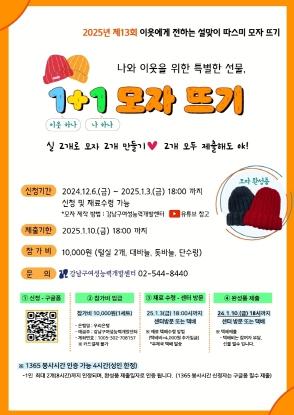 꿈이 모이는 도시, 미래를 그리는 강남구가 주민들이 직접 만든 털모자를 어르신과 장애인 등 소외계층에게 전달하는 ‘따스미 모자 뜨기’ 행사를 12월 6일부터 1월 10일까지 진행한다. 행사에 참여할 참가자는 1월 3일까지 모집한다.