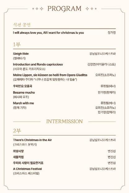 공연은 ‘Sleigh Ride(썰매타기)’와 ‘March with me(함께 가자)’를 포함한 클래식 명곡부터 한국 민요와 팝까지 다양한 레퍼토리로 구성된다.