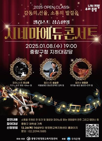 중랑구가 오는 2025년 1월 8일, 구청사 지하대강당에서 ‘첼리스트 성승한의 시네마 에듀 콘서트’를 개최한다.