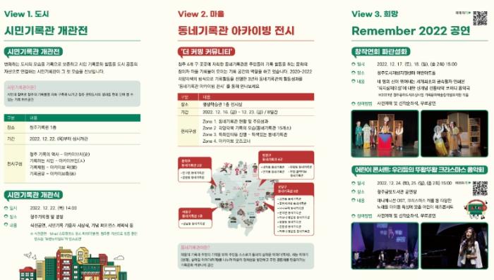 올해 ?기록문화주간?의 주제는 기록보관을 의미하는 아카이브와 시점을 뜻하는 뷰를 더한 [아카이뷰(archive+view)]로, ▷View1. 도시 ▷View2. 마을 ▷View3. 희망 ▷View4. 상생 ▷View5. 공감, 다섯 가지 테마로 청주 전역에서 전시와 공연, 네트워킹이 펼쳐진다.