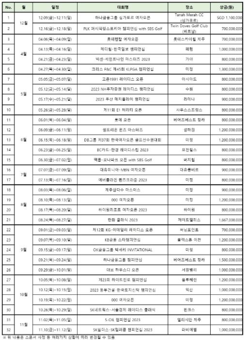 2023시즌은 지난 12월, 신규 대회인 ‘하나금융그룹 싱가포르 여자오픈’으로 개막을 알렸고, ‘PLK 퍼시픽링스코리아 챔피언십 with SBS Golf’가 베트남에서 시즌 두 번째 대회로 개최됐다. 국내 개막전인 ‘롯데렌탈 여자오픈’은 4월 첫째 주에 닻을 올리며 본격적인 2023시즌 일정에 돌입한다.