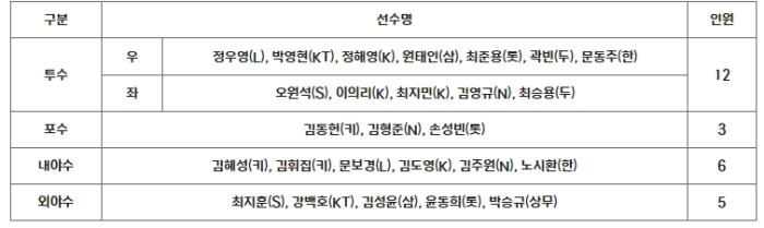 대신 예비 엔트리 20명에 포함된 투수 조병현(SSG), 이병헌(두산), 김태경(상무), 포수 허인서(상무), 내야수 한태양(상무), 나승엽(롯데), 문현빈(한화) 등 총 7명이 대구 캠프에 합류했다.