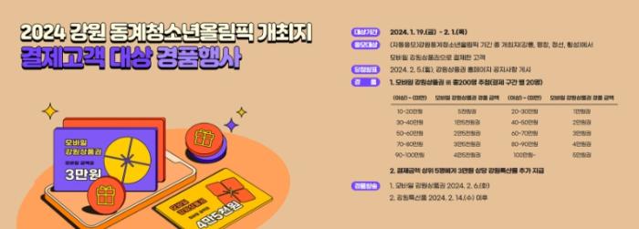 • 강원도는 2024 강원동계청소년올림픽 대회기간(1.19~2.1) 중 개최지(강릉시, 평창군, 정선군, 횡성군)에서 모바일 강원상품권을 결제한 고객을 대상으로 추첨을 통해 모바일 강원상품권 최대 5만원을 추가지급 하는 특별 이벤트를 진행한다.