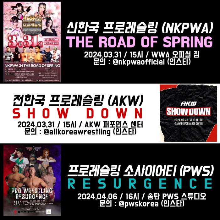 | 봄을 활짝 여는 한국 프로레슬링 단체들의 대회 일정 (사진:각 단체 SNS 갈무리) |