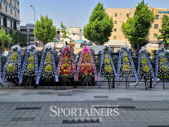 | 5일, 하이브 용산 사옥 앞에 진열된 근조화환들 (사진=고초록 기자) |