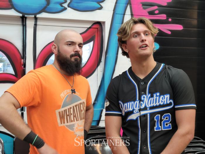 | WWE에서 활약했던 리카르도 로드리게즈의 제자인 태그팀 'THE DAWG NATION(美 3LW 소속)' 좌측은 '탑 독' 앨런 클레이볼, 우측은 '스컴 독' 세이지 매튜스 (사진=고초록 기자) |
