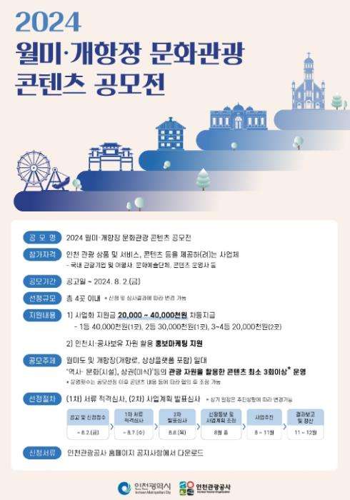 • 인천광역시와 인천관광공사는 7월 4일부터 8월 2일까지‘월미·개항장 문화관광 콘텐츠 공모전’을 개최한다.